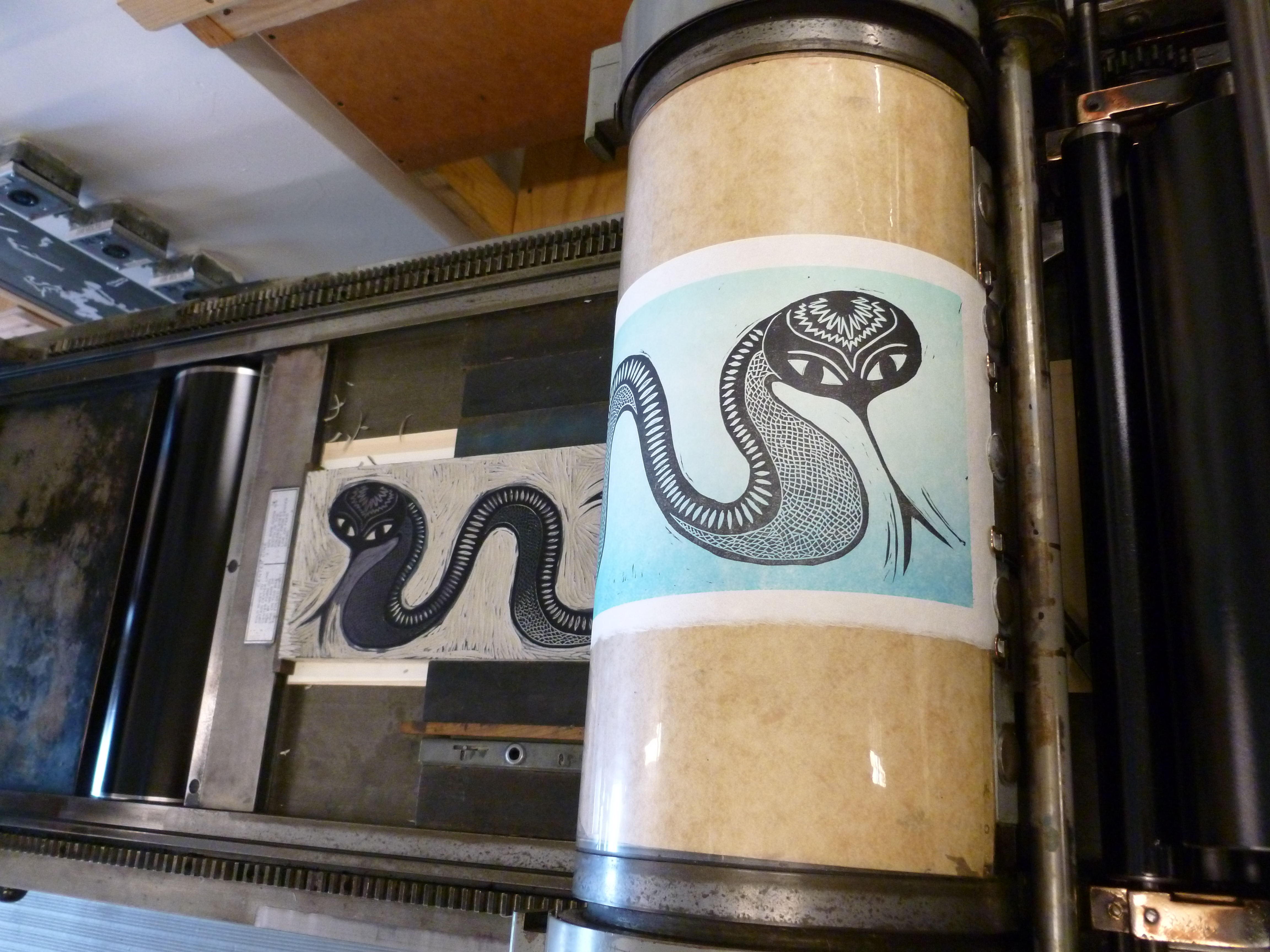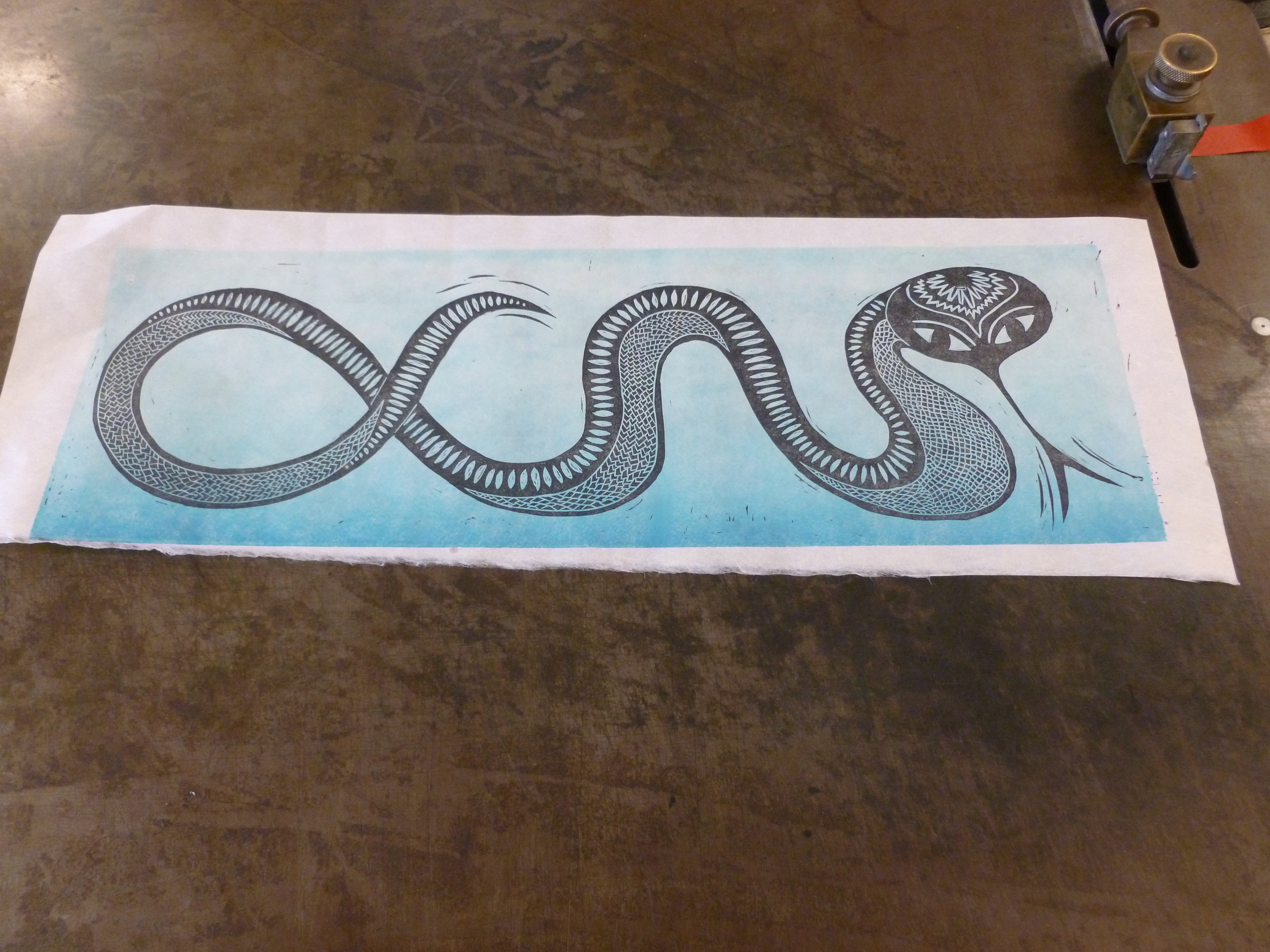 First a rainbow roll in blue as a background – it’s the year of the ‘water snake’ this year – and then the snake in black.