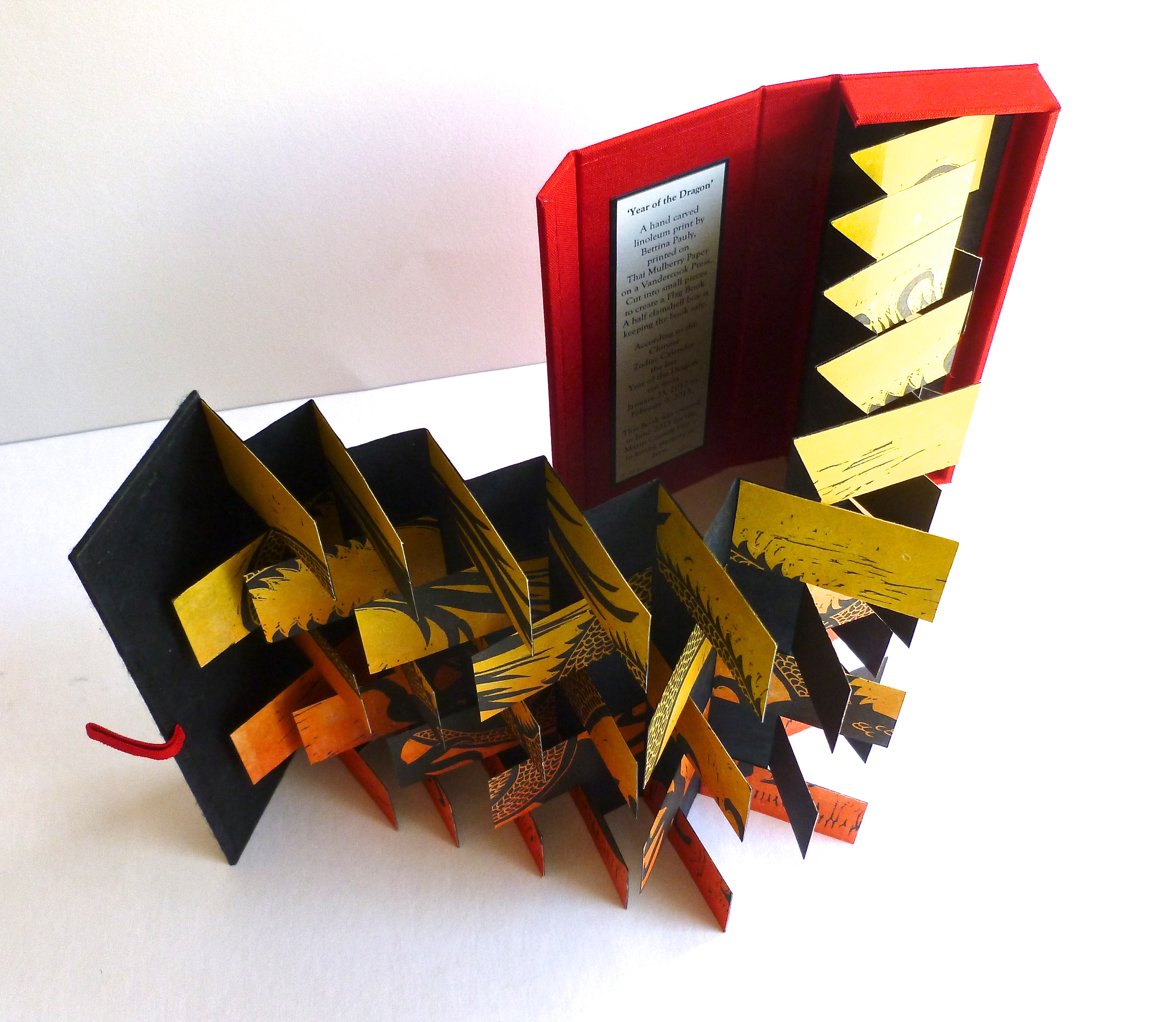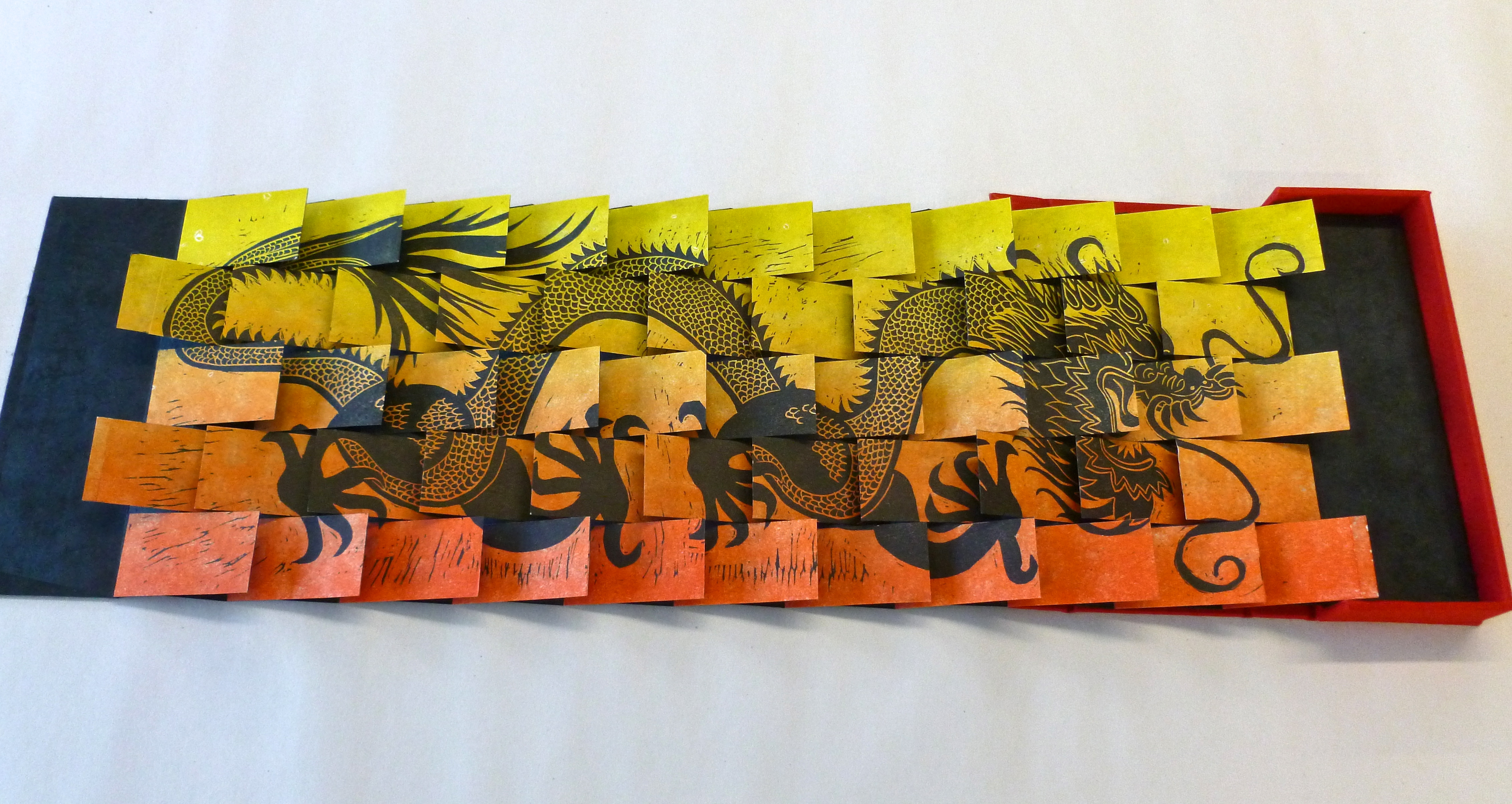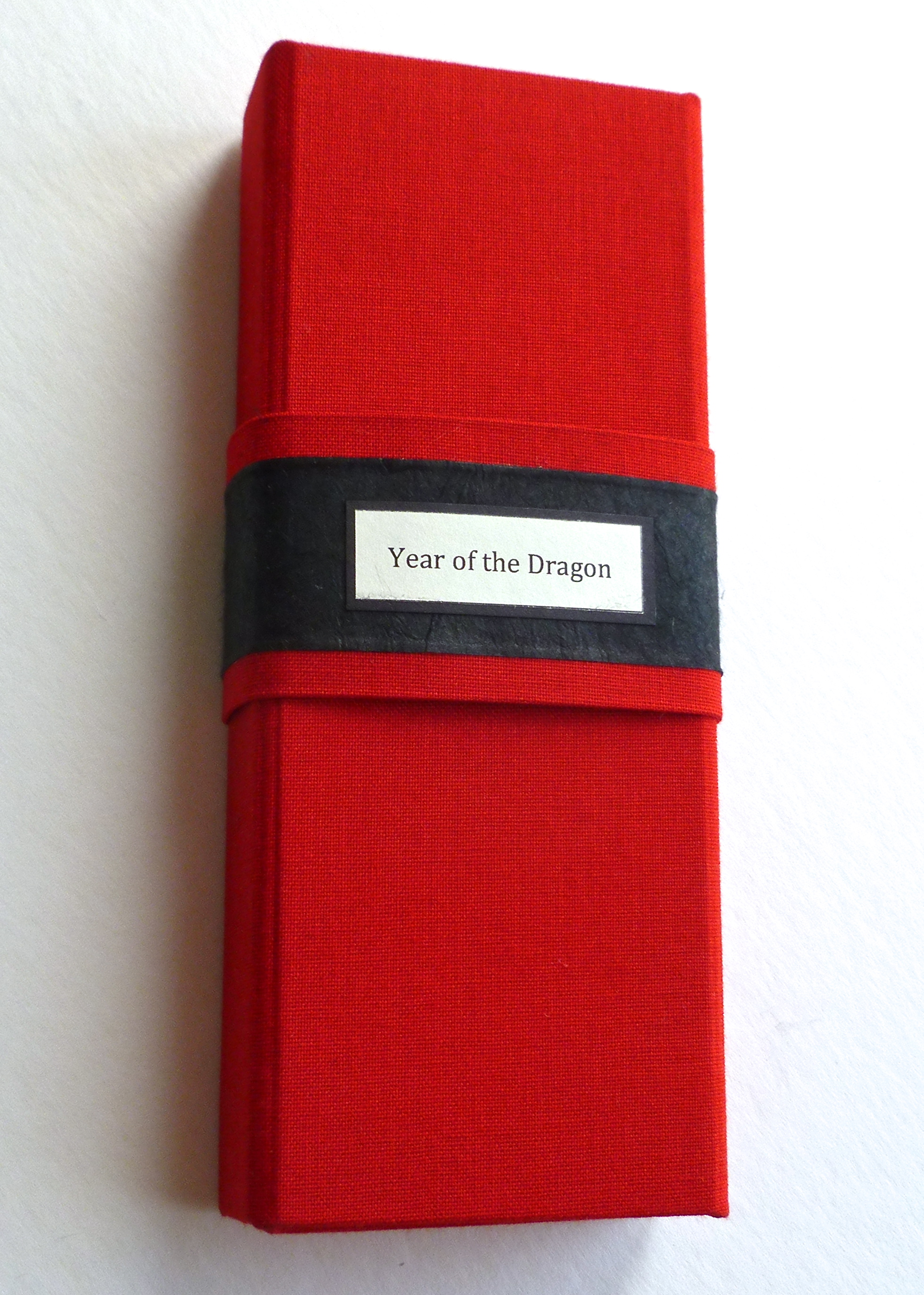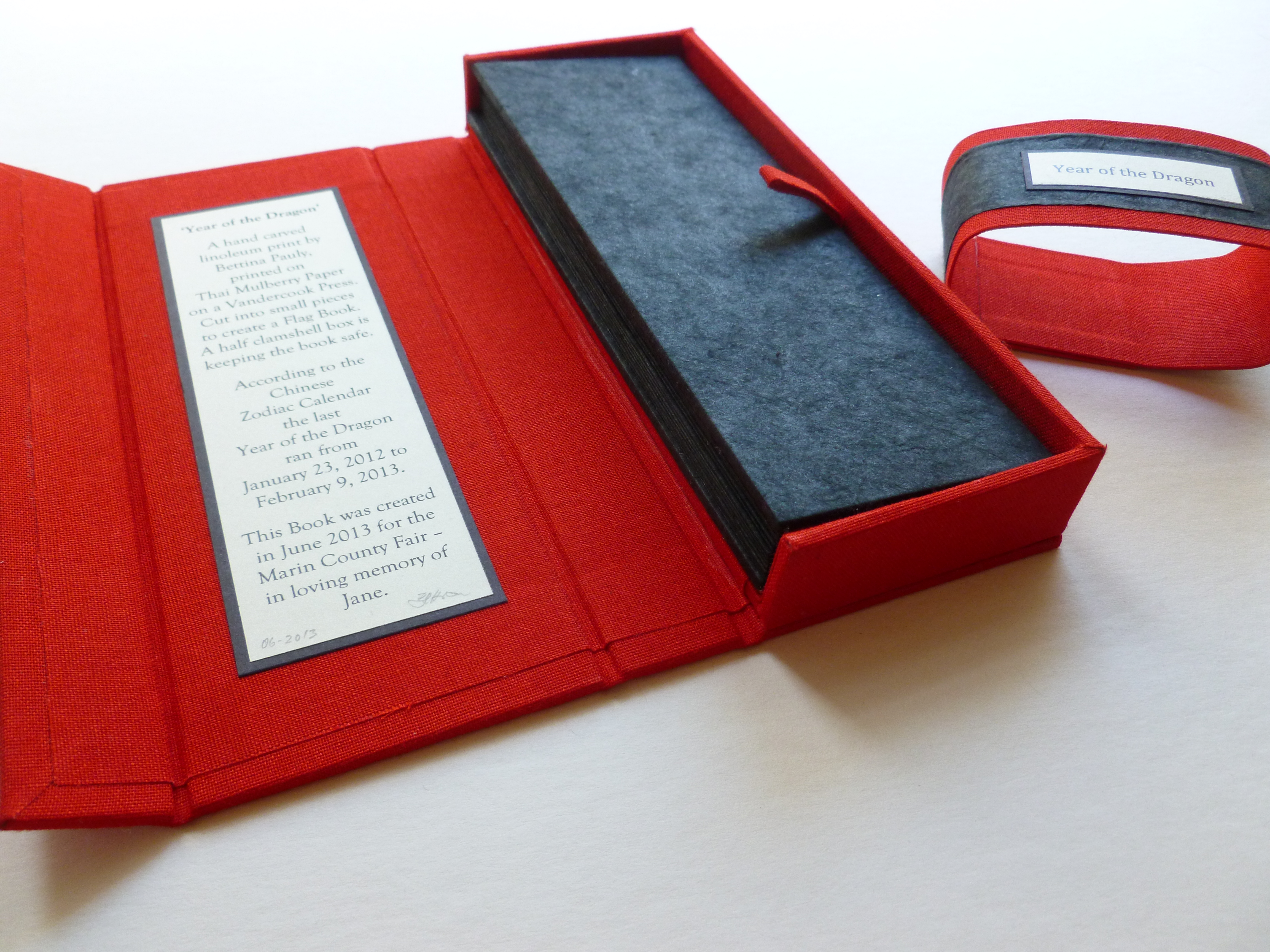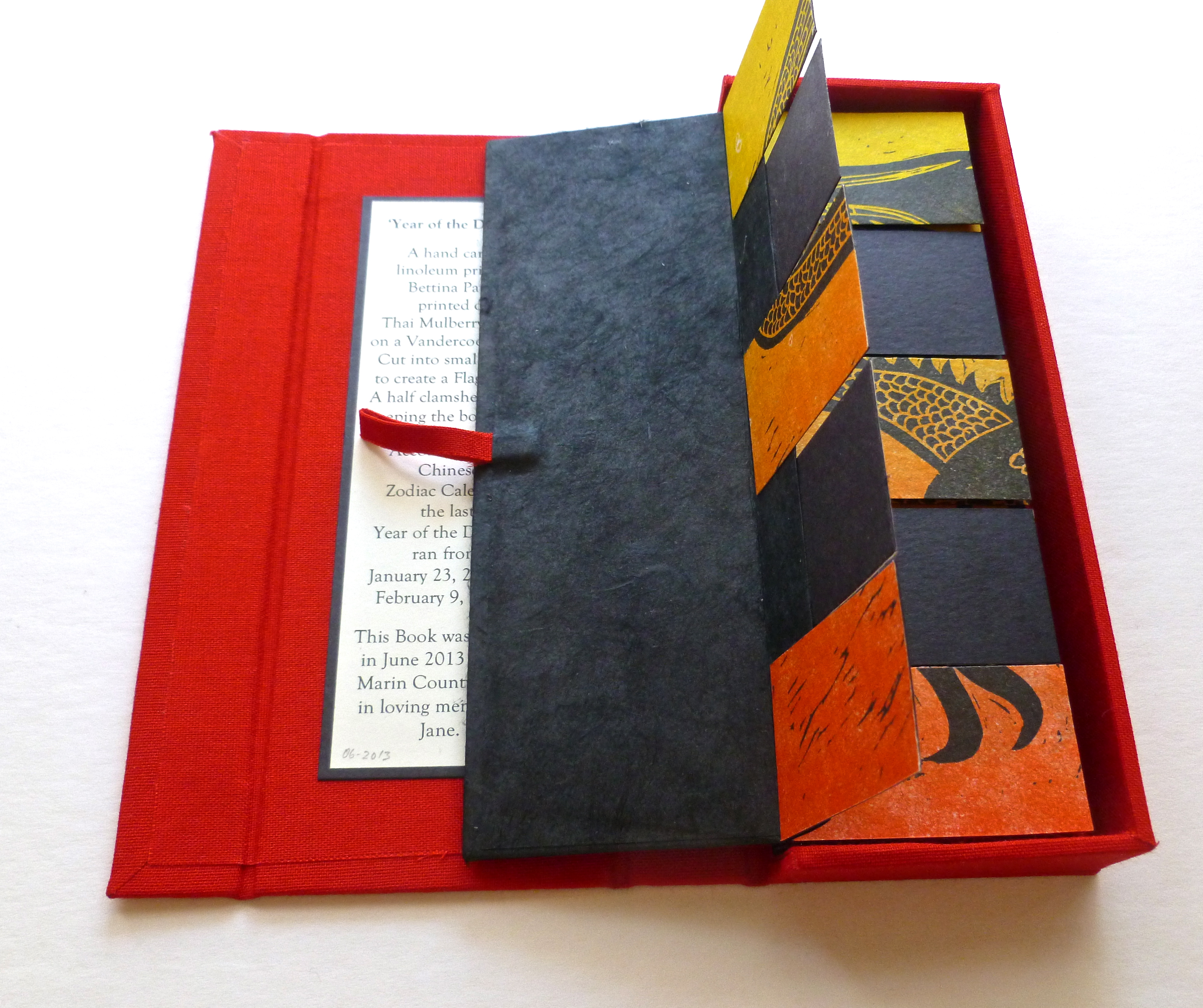 It seems like a long time since I have posted something on the blog. Why is it that time is just flying? I was not sure if I would meet the deadline for the Marin County Fair this year. Before I went to Germany I mailed in the entry fee for two books. My plan was to work on the books during my vacation, which did not happen (though I brought quite a few materials along in my suitcase!) Once back in the City I got right back into my usual busy schedule which did not leave too much time for ‘book-making’. And then, within two days, I finished a small little Flag Book – the glue was still drying when I dropped it off this afternoon. The book is glued into its half clamshell box and closes with a belly band wrapped around. It is a very nice size which fits in your hand. Height 6.5″, Width 2.5″ and Depth 1″ – when pulled out the Flag Book is about 20 inch long, it has 55 flags. The print is the hand carved linoleum block print on Thai Mulberry Paper which I had printed for the Chinese Year of the Dragon. On Monday I will find out if the piece has been accepted and will be on view over the Fair from July 3rd through July 7th, 2013.