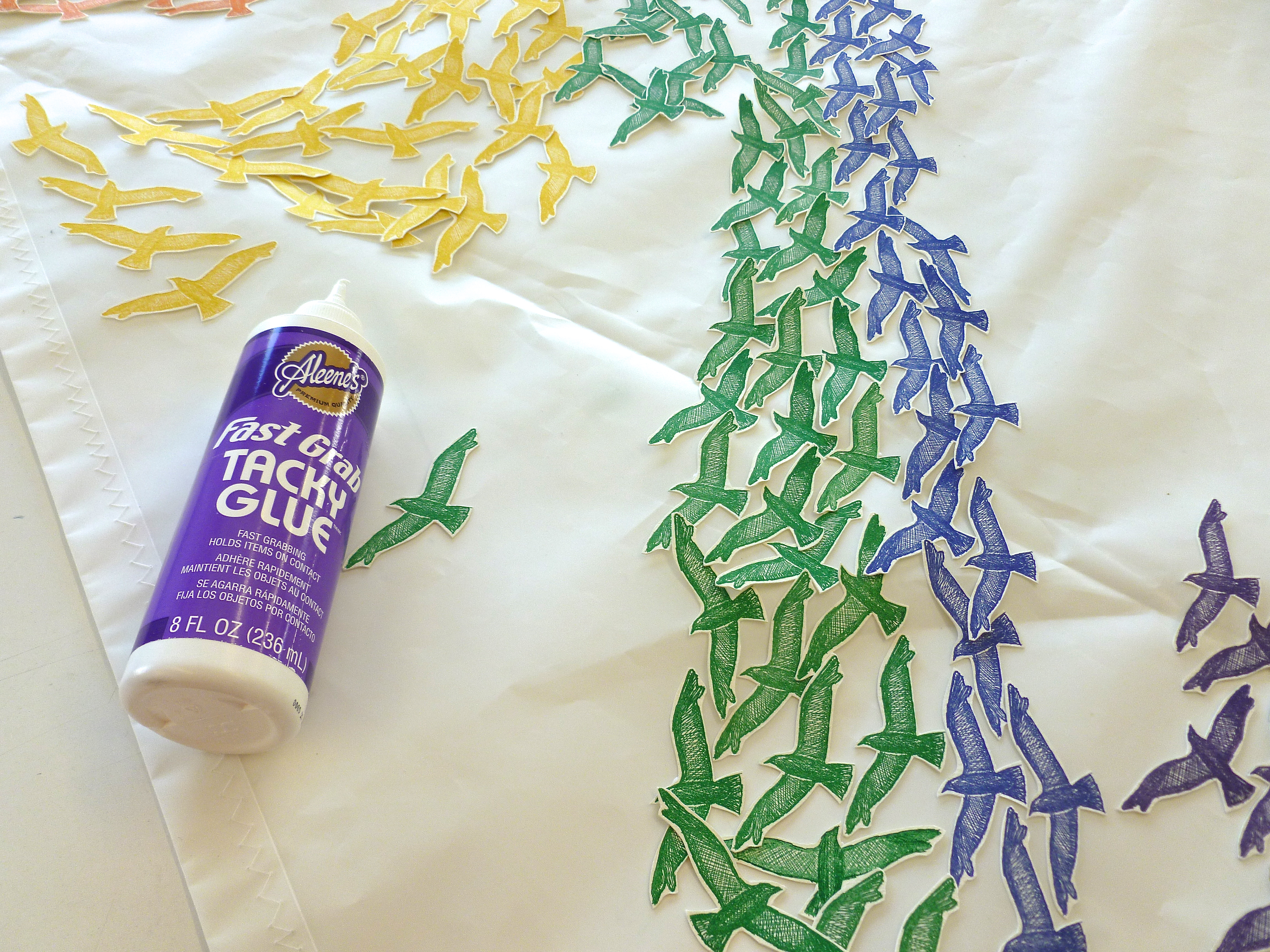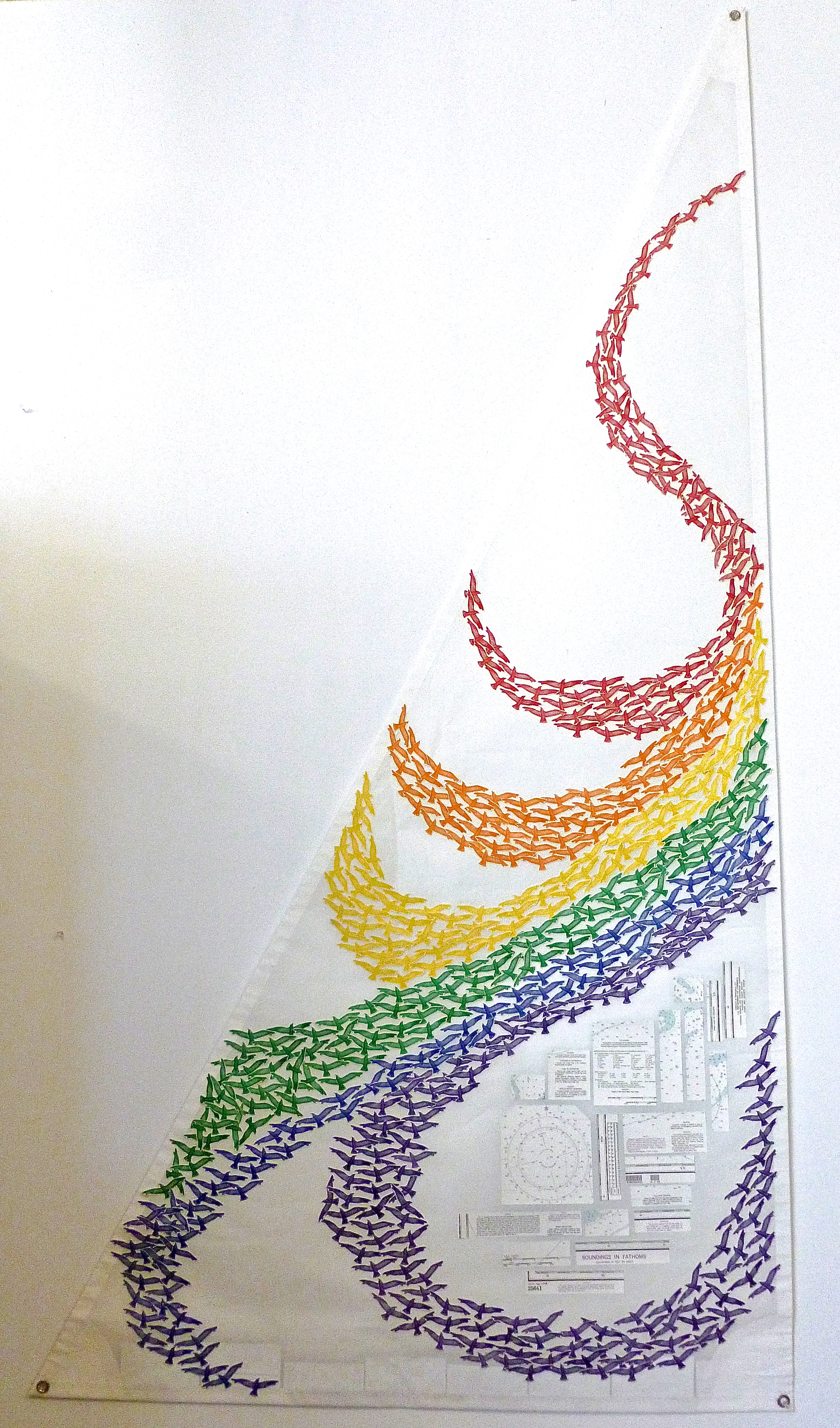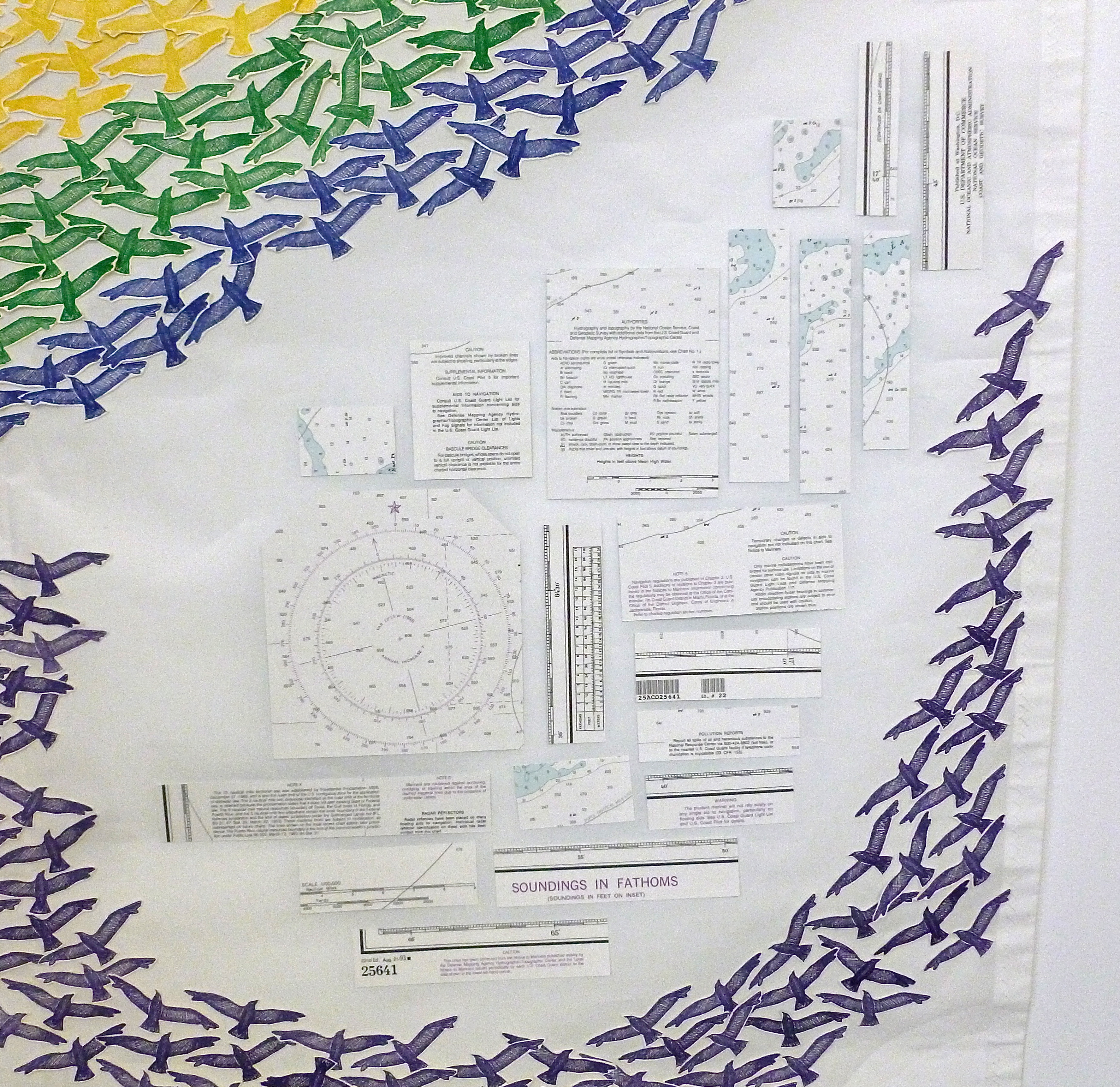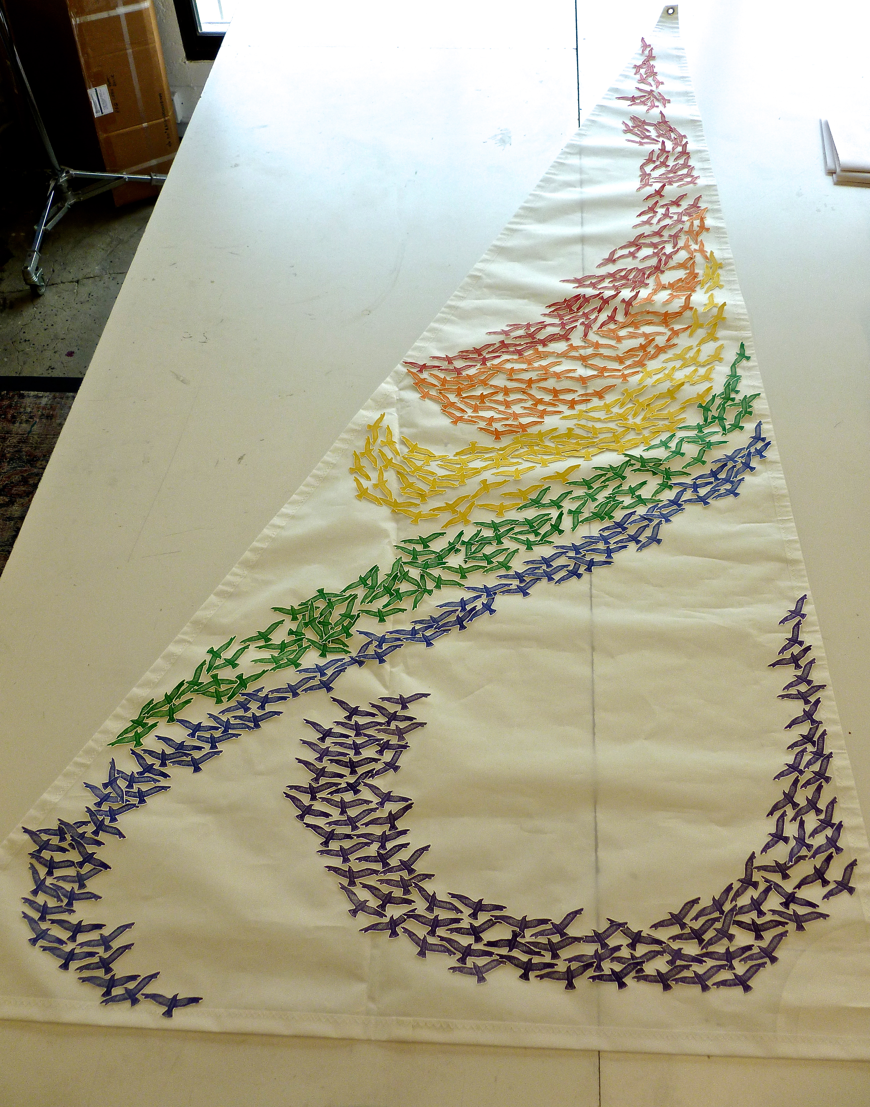 This art project is for the Goethe Institut San Francisco. The exhibition ‘Close to the Wind’ features ten German artists from the San Francisco Bay Area. Each of them was given a sail, 7.8 ft x 3.9 ft, to use as a blank canvas to turn into a work of art. Being a letterpress printer, book artist and printmaker I choose to letterpress hundreds of tiny little seagulls. The sail has a total of about 500 glued on to it. The first picture shows the rough layout, with the seagulls just laid on the sail. My first idea was to stitch them on, but then I decided to glue them (the time factor being part of my decision).