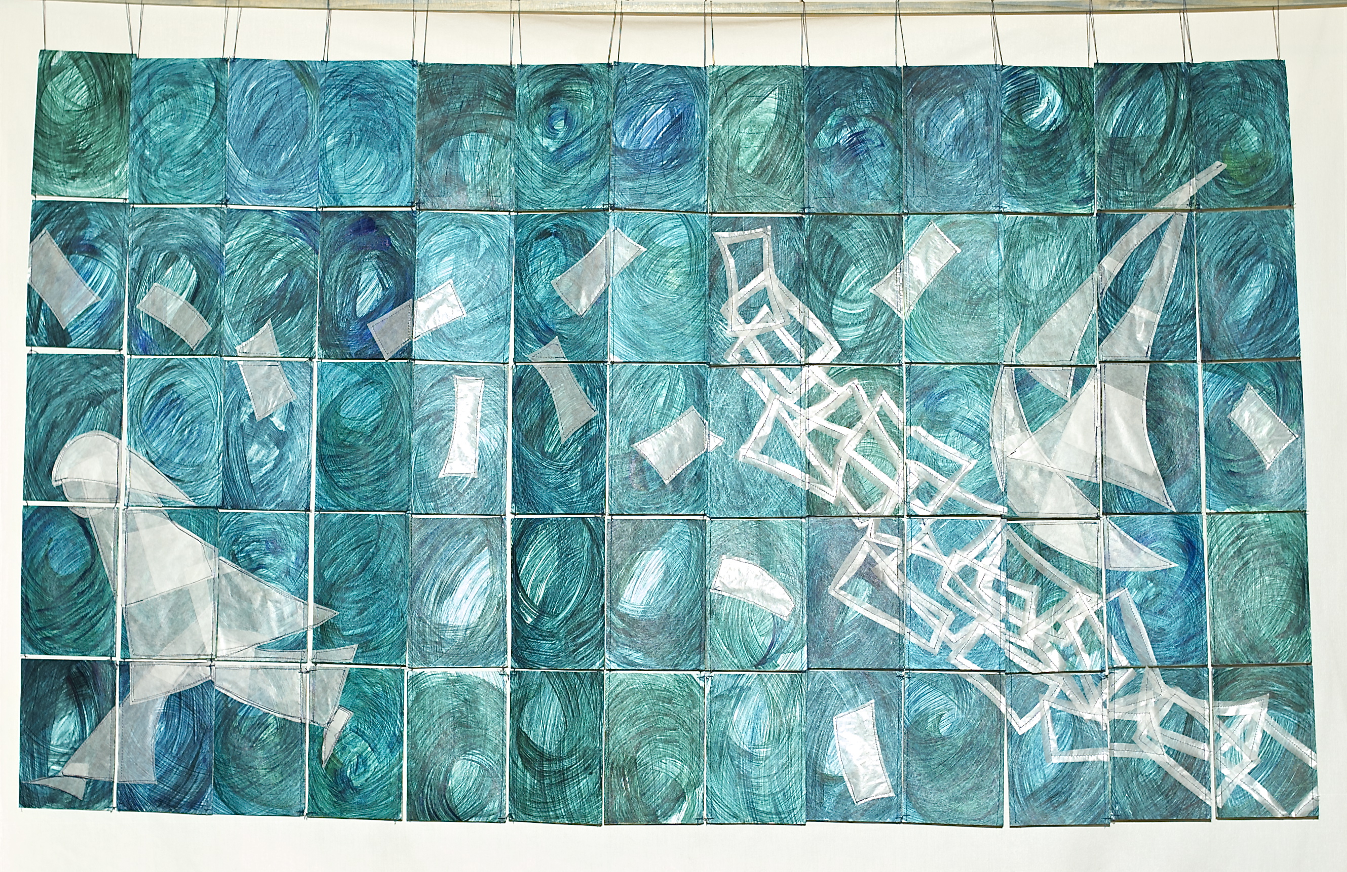 the scene shown on the piece is made by patch-working glassine paper onto the tyvek, using a sewing machine