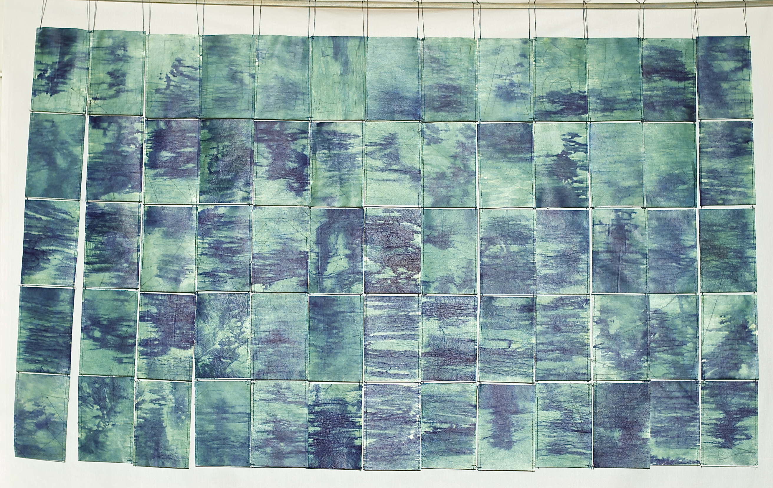 65 mono prints, acrylic paint, on 6×4 inch pieces of tyvek paper