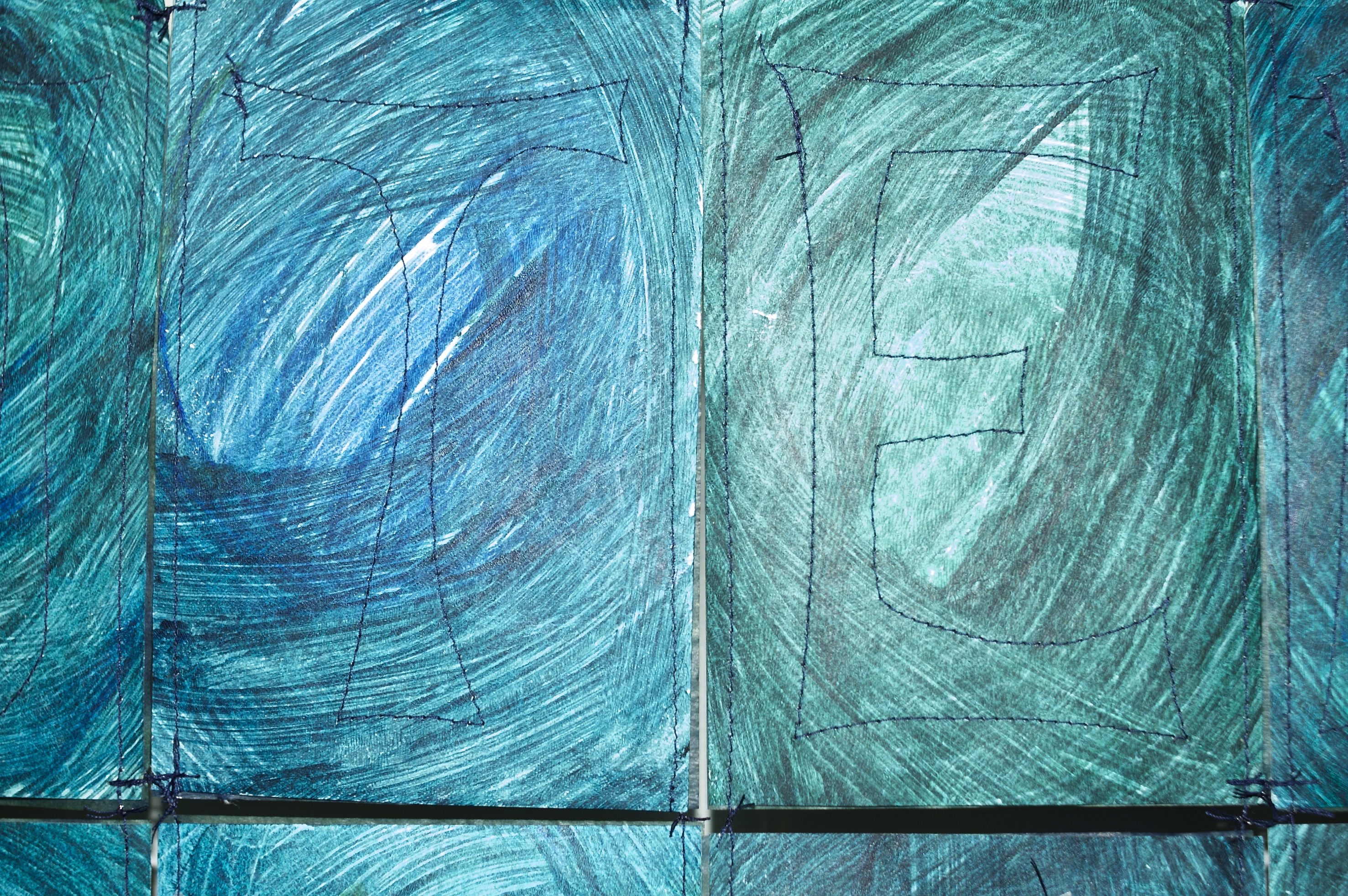 first row – 13 letters – spelling out ‘klabautermann’ machine-stitched onto the paper